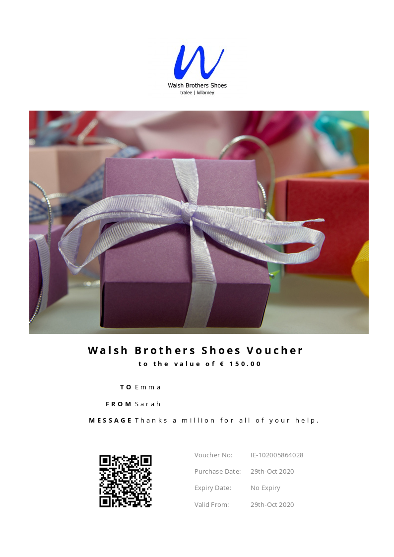 Walsh Brothers Shoes allows you to purchase instantly printable gift vouchers, special offers and tickets using the Voucher Connect platform.